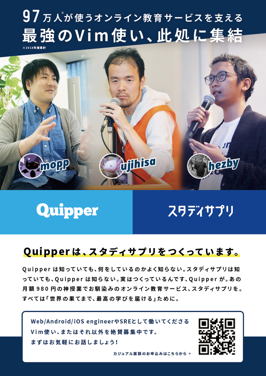 こんにちは。Quipper採用担当の鈴木です。今回の記事は、@moppによる「VimConf 2019 の運営スタッフと登壇とスポンサーをした話」です!是非、ご覧ください!