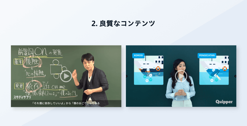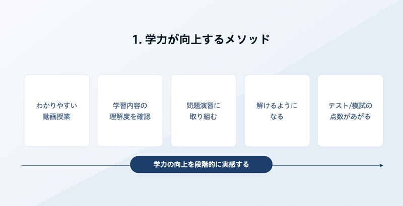ユーザーのニーズを満たし、使い続けていただくために私達が提供すべきことは、学力が向上するメソッドであり、良質なコンテンツであり、それらを続けていけるような学習体験/行動の設計です。様々な手技/手法はあれど、基本的な勉強のスタイルは普遍です。まずはインプットを繰り返し、次にアウトプットを重ね、応用を通して考え方を定着させること。
