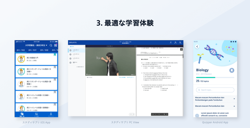 最適な学習体験はユーザーによって異なります。スタディサプリだけで受験を目指す学生もいれば、塾や予備校と併用しながらわからない箇所だけ集中的に使う、というユーザーも少なくありません。もちろんその理解度もさまざまです。