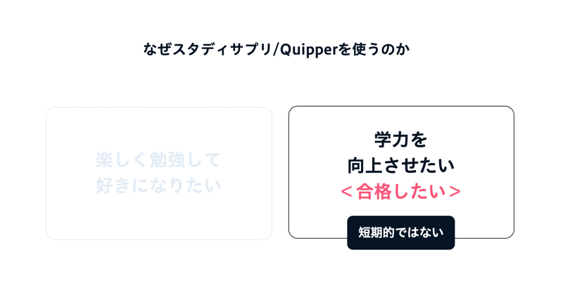 スタディサプリ(大学受験講座や高校講座)ユーザーの大半は、大学受験にむけてスタディサプリを使っています。テストの点数をあげたい、学力向上をしたい、という想いで始めています。小学生くらいのお子さんであれば学習習慣を身につかせたい、勉強が好きになるように楽しい体験をさせたい、などがあるかと思いますが、前述のようなユーザーにはもっと明確な目的があります。