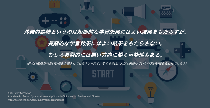 - 外発的動機を与え続けても、それがなくなると継続しなくなる