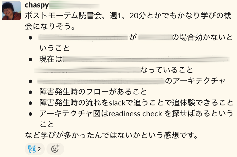 Quipper SRE Team では New Joiner が入ったタイミングで過去のポストモーテムの読書会をはじめてみました。とても有益な取り組みですのでオススメします。
