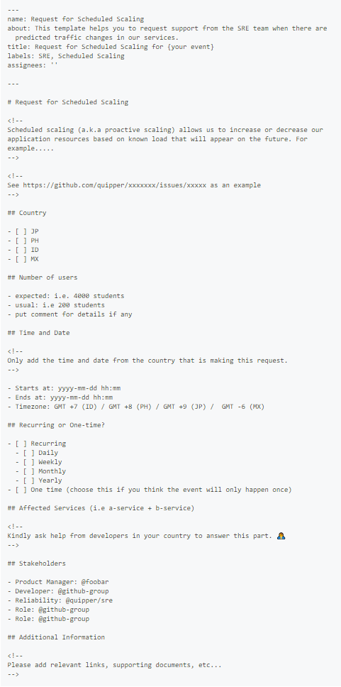 Push 通知や コマーシャル、キャンペーンによる突発的な負荷は Auto Scaling だけで対応することは難しく、Scheduled Scaling を行うことになると思います。Quipper では事前にそれらを円滑に行うための Issue Template が用意されており、Product Manager, Business Developer, Marketing Team と協力してシステムの信頼性を保っています。