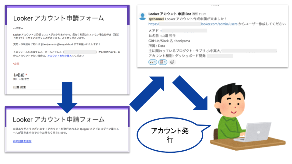 上図のように Google フォームから必要事項を記入してもらい、申請が来ると Slack で通知が来るようにしています。今回ご紹介する SDK を使うとこの辺の新規ユーザー作成および権限付与も完全自動化が可能ですので、それもおいおいやっていきたいです。