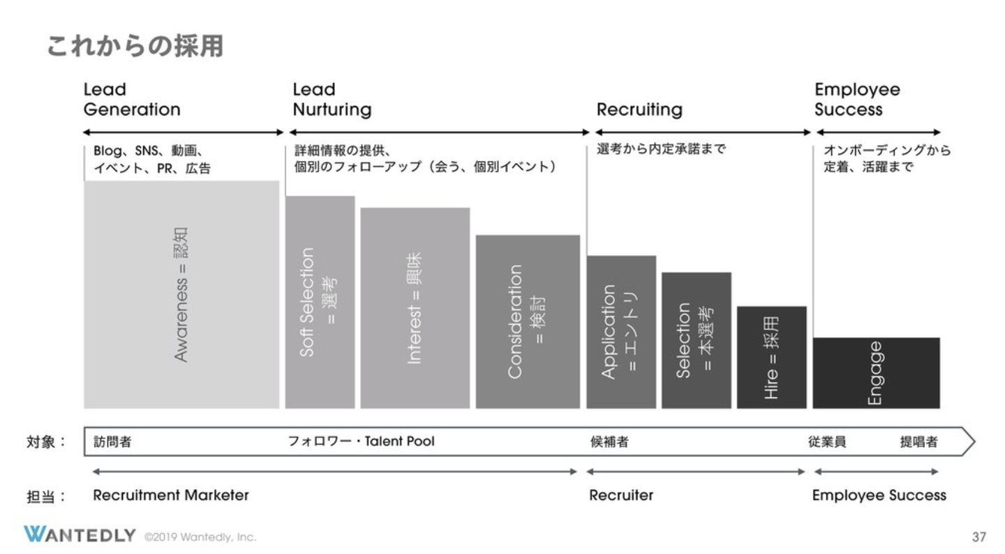 面接とカジュアル面談の差異を説明するため、Wantedly社が公開する「リクルートメント・マーケティング入門:あたらしい採用の常識 / Recruitment Marketing 101」より採用のフェーズを表現する図を引用します。*1