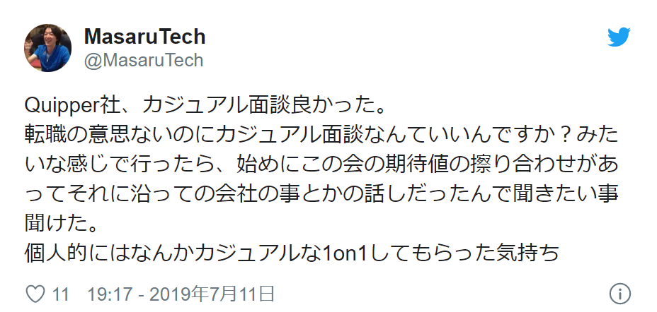 最後に、私が行ったカジュアル面談で最も印象深かったできごとを紹介します。それはカジュアル面談に参加された方に以下のような tweet をしていただけたことです。