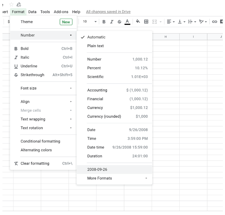 Google Spreadsheet では Format -> Number -> 2008-09-26 とします。