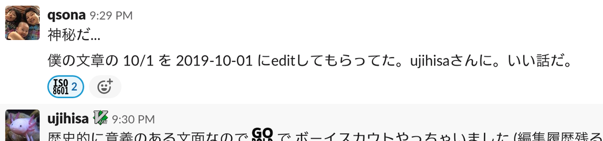 検索することのできる「名前」がついているということはほんとうに最高で、一言「ISO 8601 だよ」というだけで表記が一気に明確になるのは嬉しいです。Quipper 社では Slack reacji の :iso8601: の出番がそこそこあります。