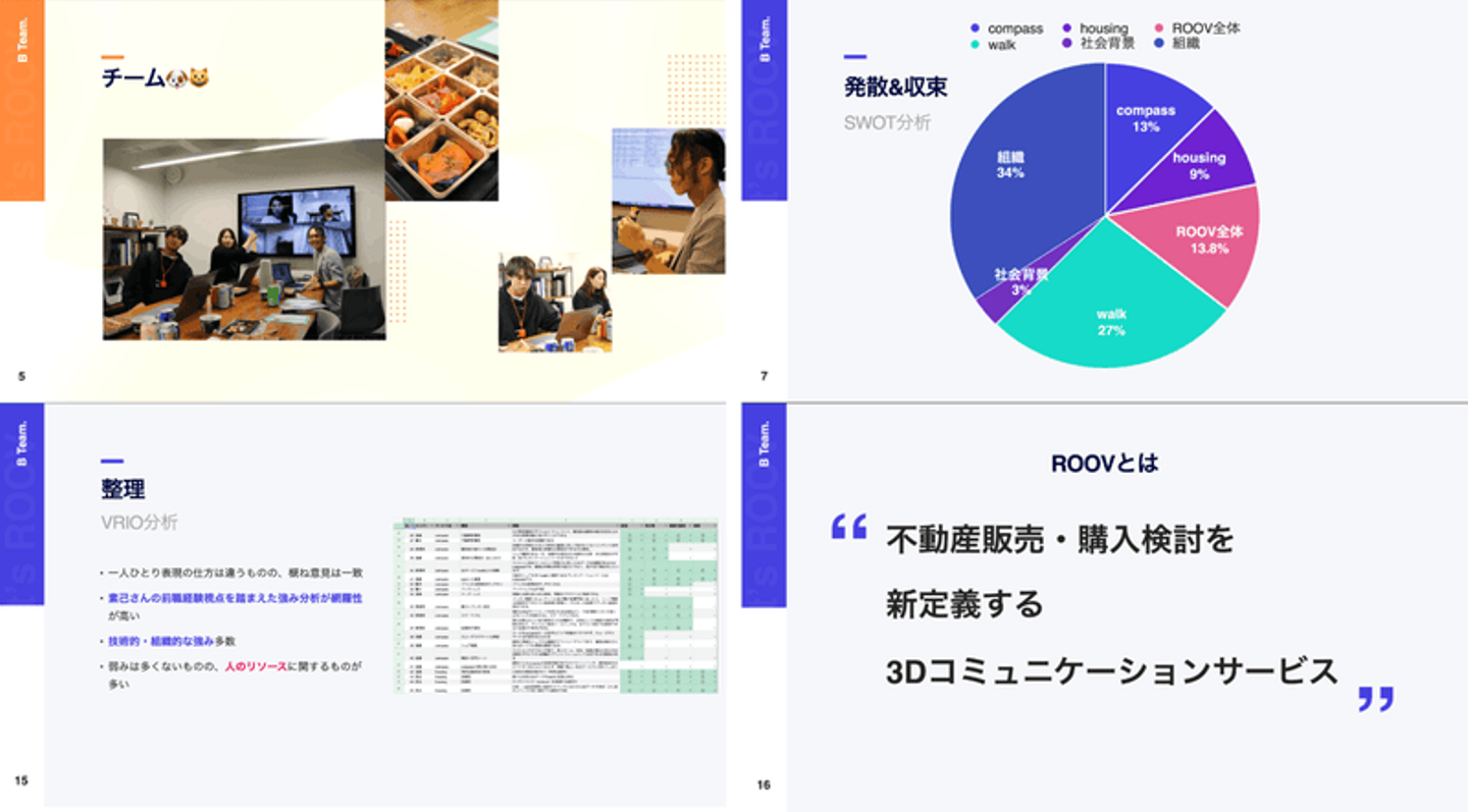 Dチームでは、運営側が用意したフレームワーク通り進めるのではなく、一度立ち止まって、今回の企画の趣旨を振り返り、「新しく入った人に、会社やROOVについて知ってもらい、一緒に仕事をしていこう、と思えるプレゼンにしよう」とチーム内でコンセプトを固めて、「ROOVとは何か、なぜならこういう理由で、今後どうしていきたいか」という内容のスライドを議論の過程で1人1枚作り発表して、価値観のすり合わせをしました。