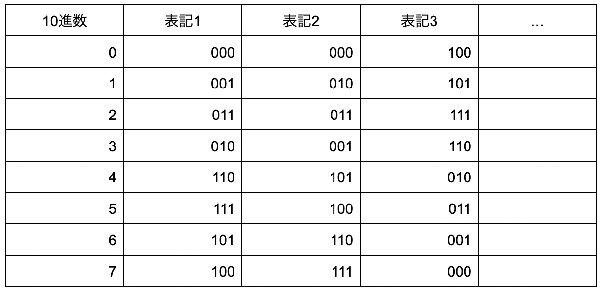 のように複数の表記が考えられます。隣り合う数字のハミング距離を1と制限した場合、3bitで数値を表現する方法は144種類存在します。