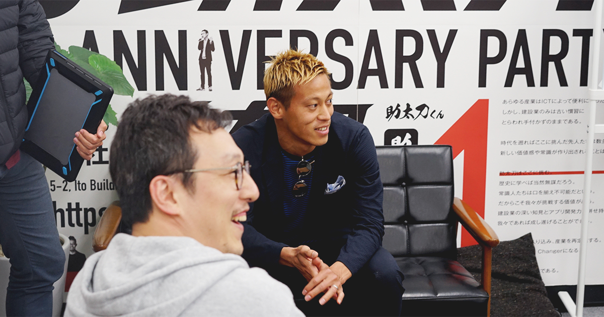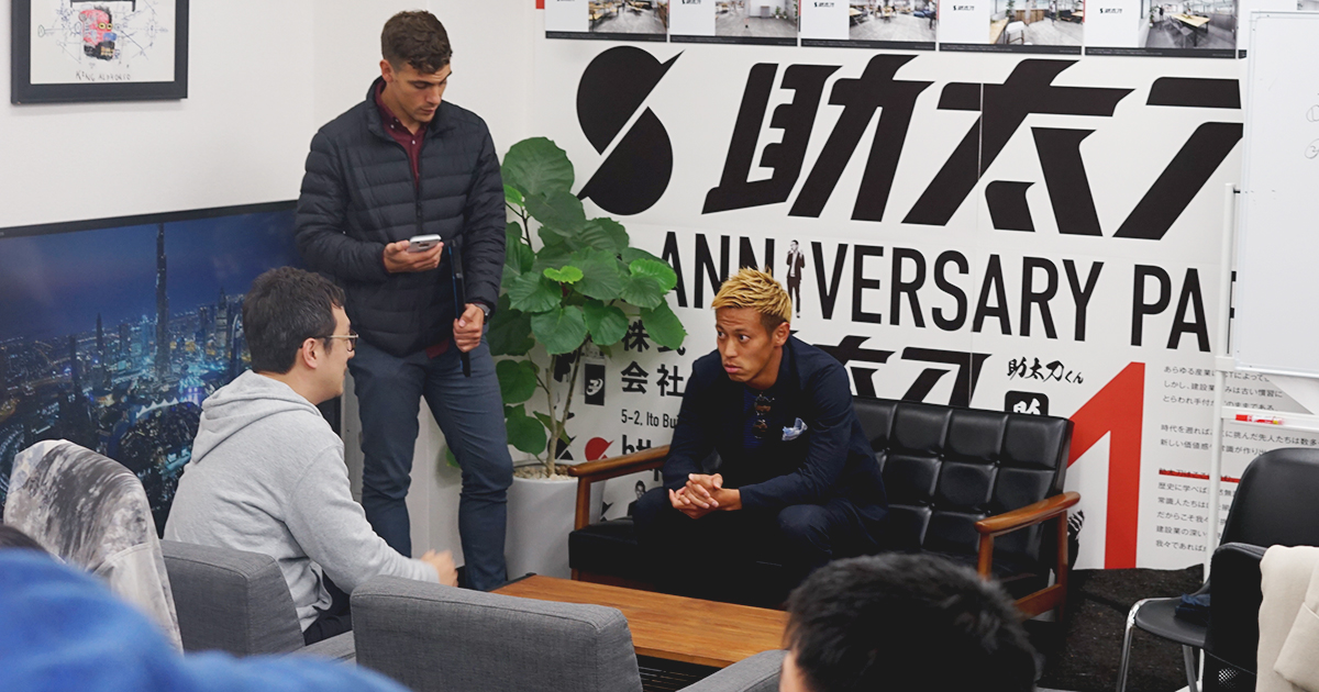 世界で戦うビッグプレイヤーが助太刀のソファーで代表の我妻とビジネスの会話をしている。傍らで、動揺を隠せない私。もちろん他の社員も興奮状態。みんな本田選手と我妻との会話に耳を傾けながらそわそわ仕事をしていました笑