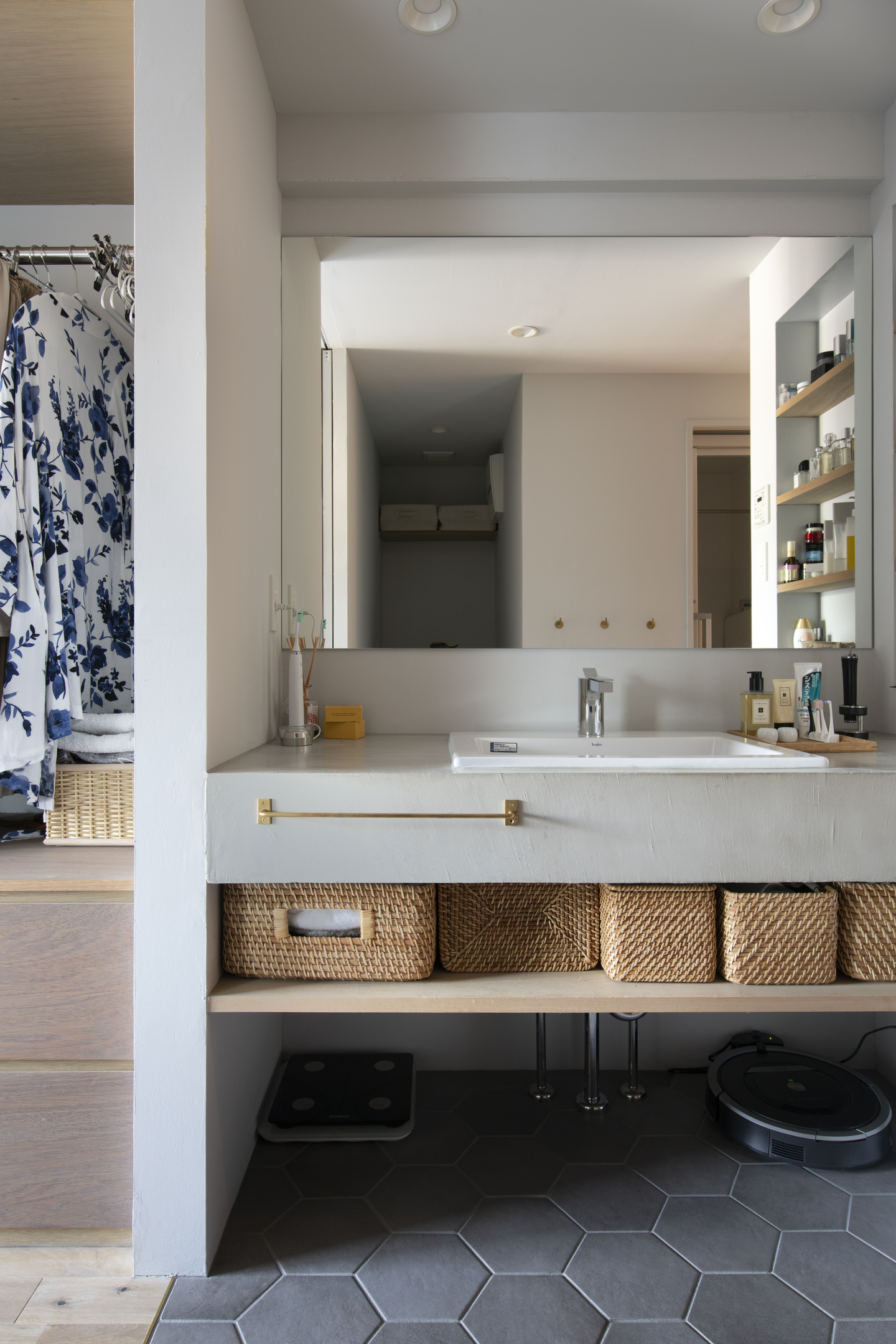 ゆったりとしたホテルのようなサニタリースペースは、2方向から入れる回遊性がある場所に。窓の外に広がる緑の景観や自然光も家の一部。自然や素材感に包まれて、ゆったりと時間を過ごせる空間になりました。