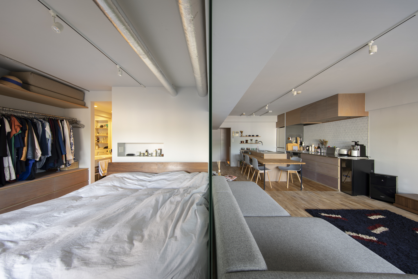 全体的に統一された色彩が光を和らげ、モダンな雰囲気の中に優しさが感じられるI邸。家の中心を通っていた大きな梁から発想したテーマは「パブリック」と「プライベート」のゾーニング。すりガラスの間仕切り壁で2つの空間を分け、通路もないシンプルな導線に整理しました。
