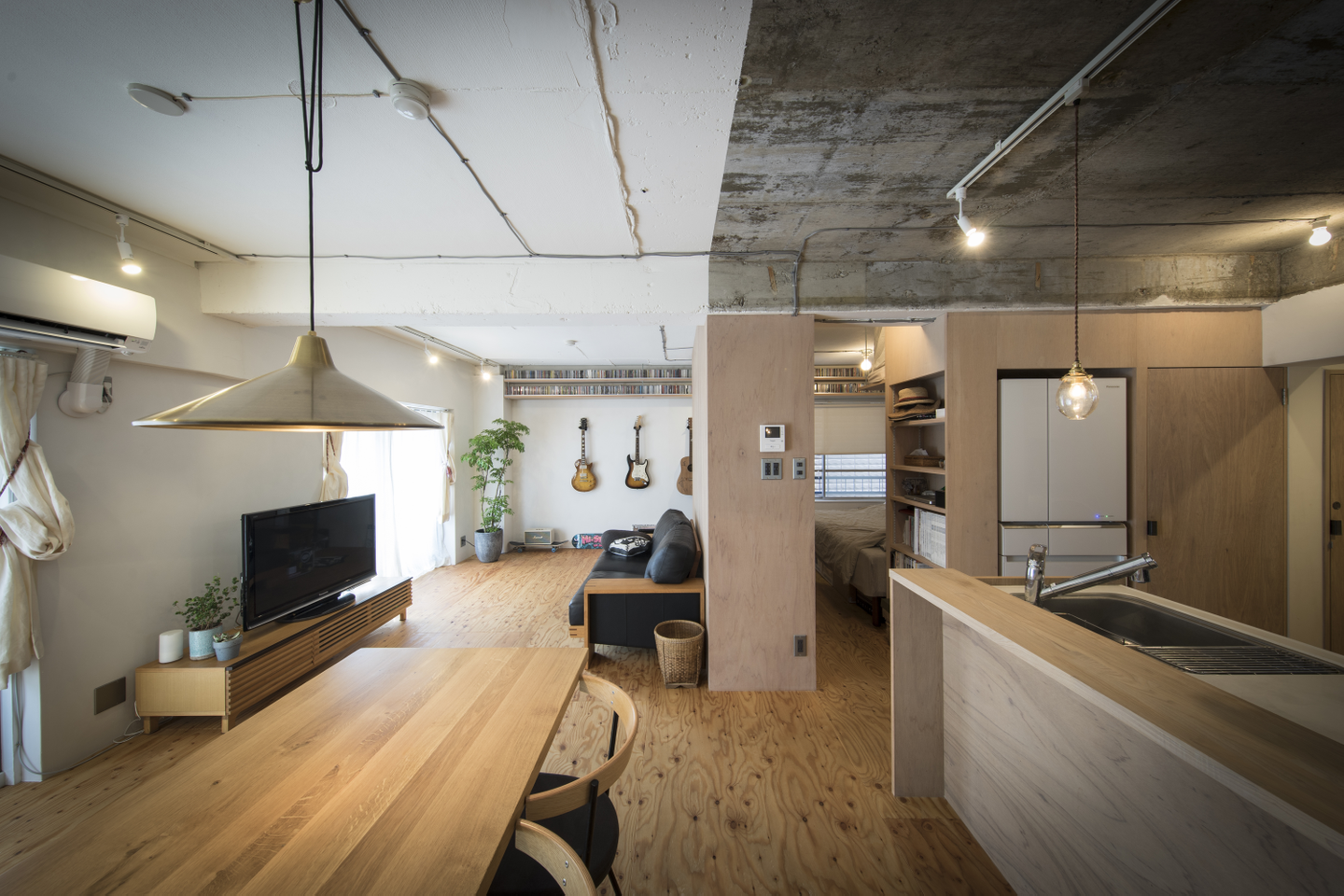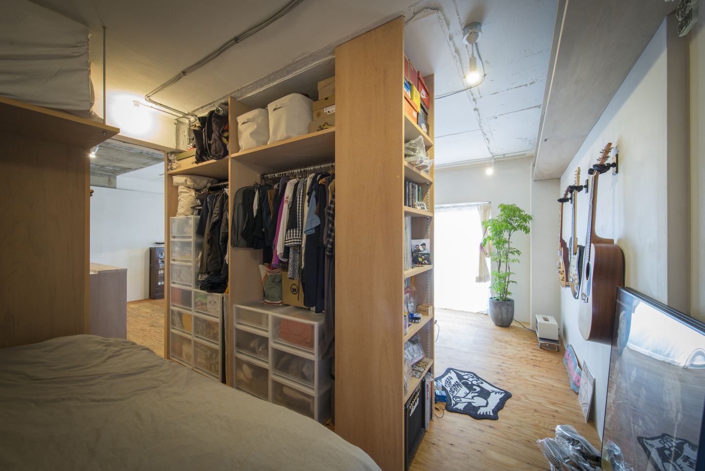 2LDKにしていた間仕切壁を取り払い、ワンルームに。寝室のクローゼットを兼ねた収納壁をつくり回遊性のある間取りにすることで、ワンルームでありながらプライベートも確保された空間になるように設計しました。