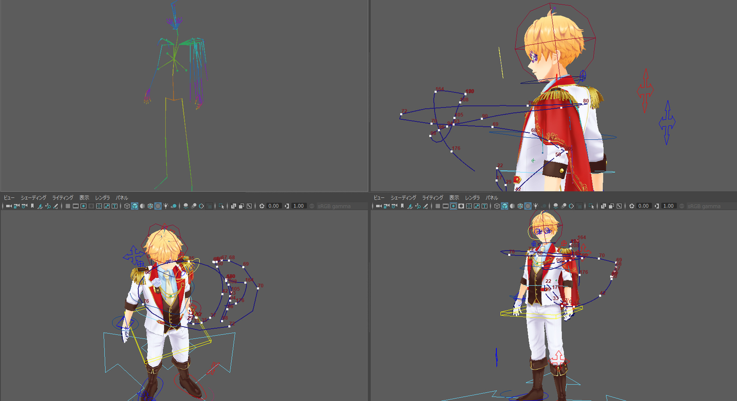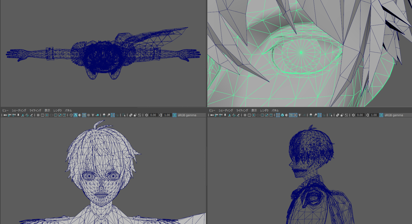 ゲームを想定した際、ユーザーに違和感を持たせないようリアルな構造を意識しつつも、どの角度から見ても2Dイラストの印象に近づくように調整すなどしてキャラクターのイメージを気にしながら制作しました。シルエットにポリゴンを割いて、ローポリゴンに見えないように工夫をしました。
