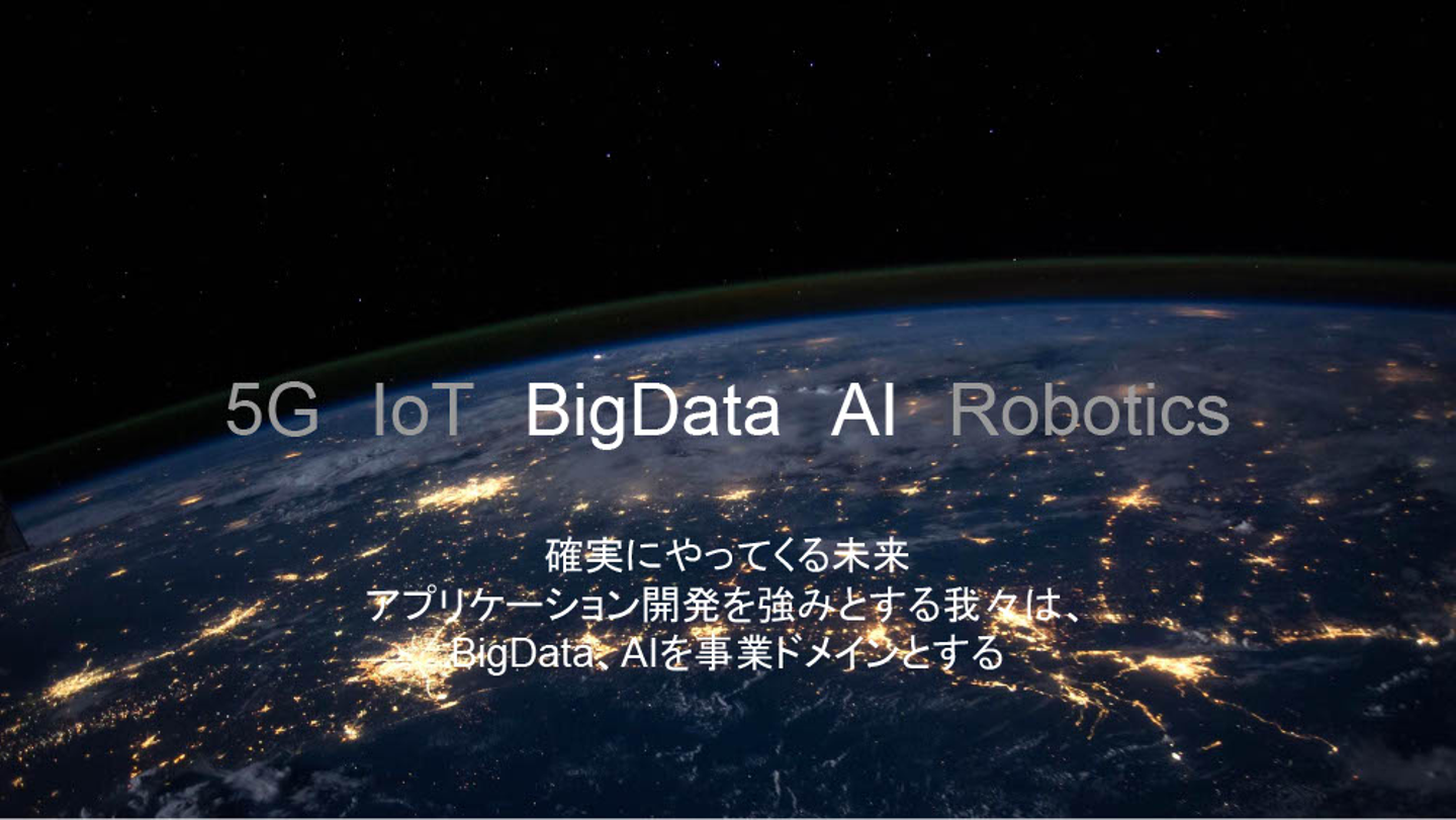 「5G(第5世代移動通信システム)の上に、IoTが乗り、大量のデータが蓄積されて、AIにより解析し、ロボットが処理する」このような確実に来る(又はすでに来ている)未来において、クラウドアプリケーション開発を強みとする私たちは、新たにBigDataとAIを事業ドメインに加えます。それらの先端技術を駆使したシステム開発を通して顧客の業務課題を最速でより強靭に改善します。