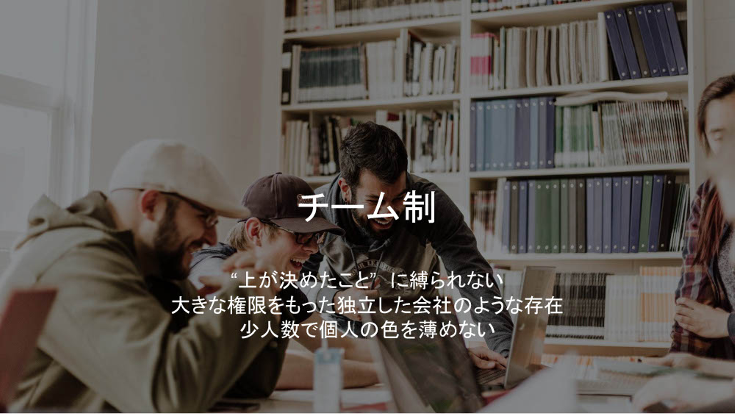 鈴木商店では5名以上10名未満のチームに分かれ、各チームが個別に組織を運営しています。チームプレイでプロジェクトを円滑に進行させることだけではなく、チーム単位での採用活動や経費管理など、本部業務に関わる大きな権限も併せ持っており、それぞれが小さな会社のように機能する存在を目指しています。