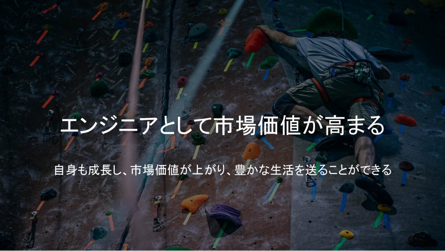 多くの企業で採択されているような、各個人の短所に目を向けて短所を伸ばす育成方法は行いません。なぜなら、個人の長所をいかに引き伸ばしていくことができるかに重きを置き、自分ができないことを周りのメンバーが補っていくことで、互いに学び、好奇心を尊重し、切磋琢磨する文化を醸成させながら組織的な開発力を化学反応的に強化し、その結果として、エンジニアとしての更なる成長と市場価値向上を目指しているからです。