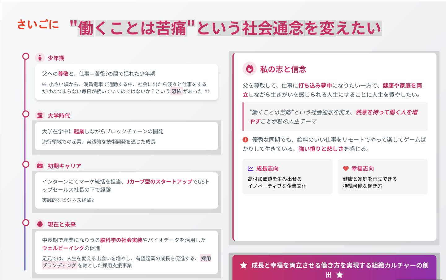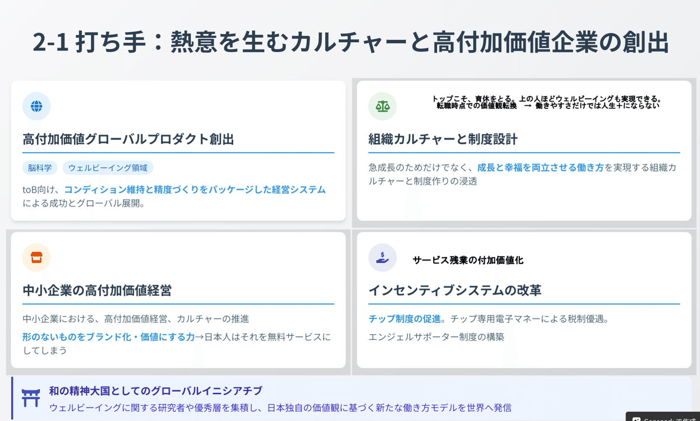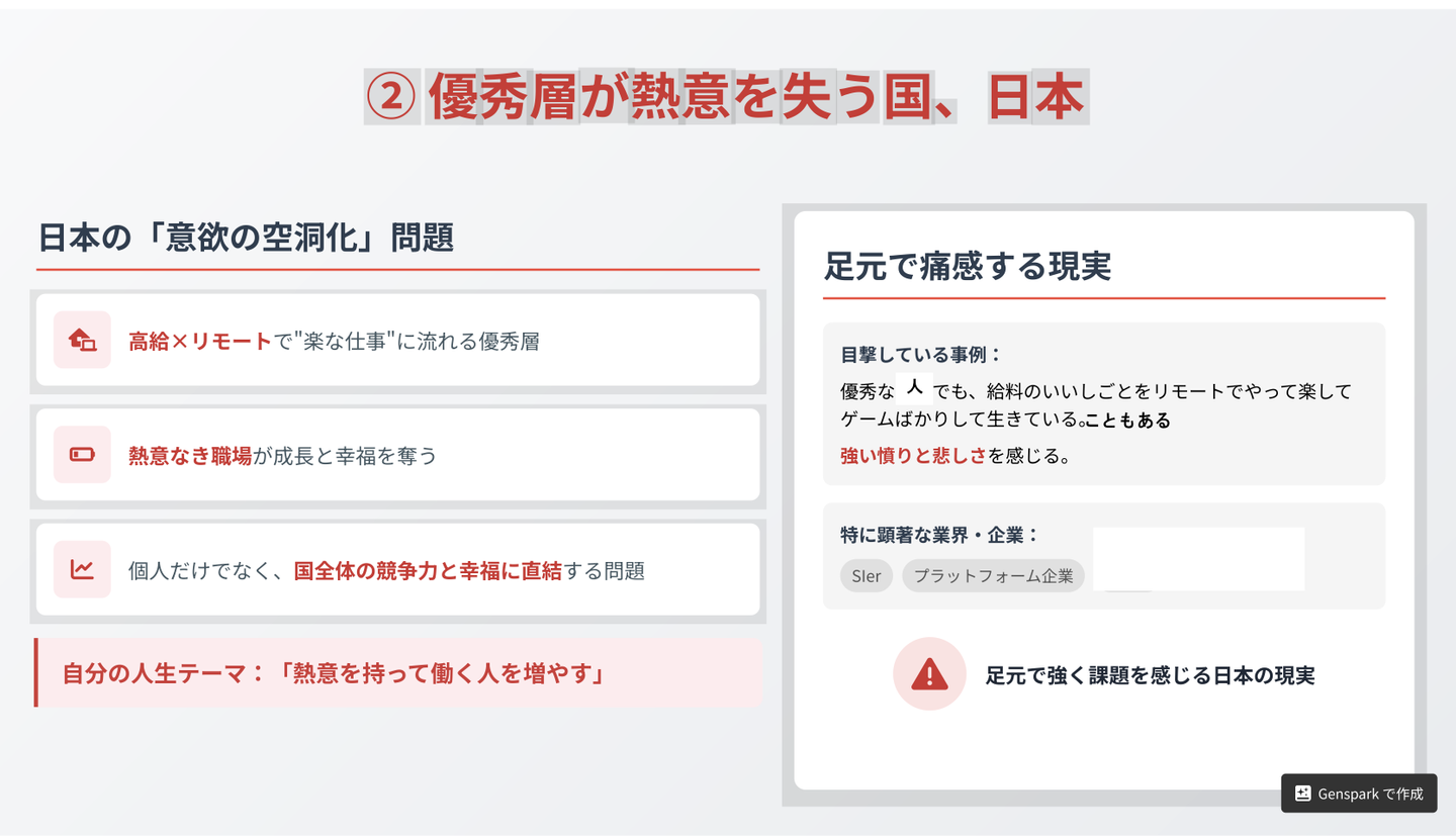 こちらの松村さんと議論する機会をいただいたので、自分が考える打ち手をまとめました。 数時間でAIと作ったもののためツッコミどころはいろいろありますが、、 改めて、Synayakaでは、日本のボトルネックである「働く熱意、やりがい」にダイレクトにアプローチするための事業を、短期的にも長期的にも取り組んでいるし、それを加速させていきたいと思いました。 Synayaka / 株式会社しなやか | ...