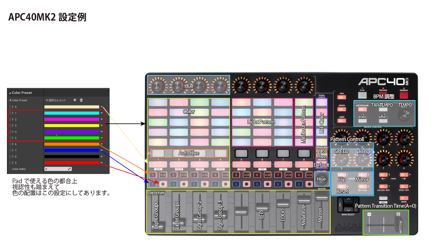 こういったインターフェースを用意することで、初めて触るUnreal Engineを「自分のツール」として照明さんに使ってもらえるようにしました。レクチャーも1回ぐらいしかできないので、その中で理解できるようにと考えてつくってあります。照明さんが普段やっている作業より少し大変かもしれませんが、これがあればすべての会場照明をコントロールできるんです。