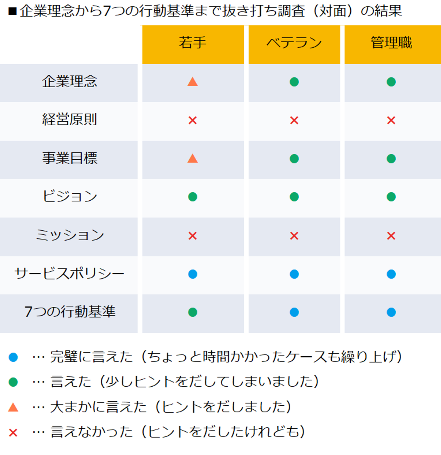 研修から約ひと月後に3名の社員に企業理念群を覚えているか、抜き打ちで調査してみました。