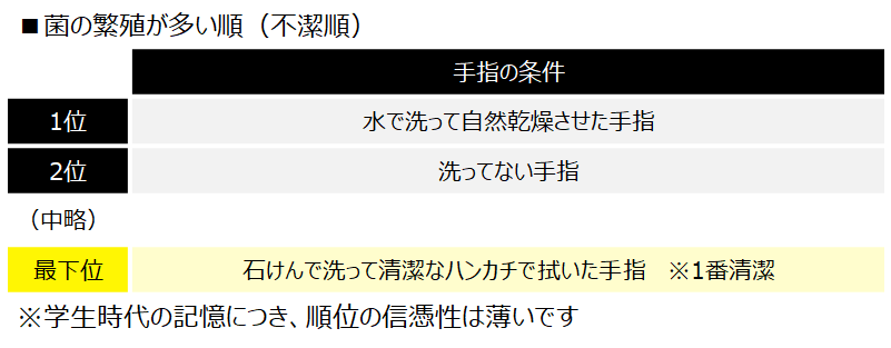 学生時代に手指の菌の培養(繁殖)の実験をしましたが、結果は以下の順だったと思います。