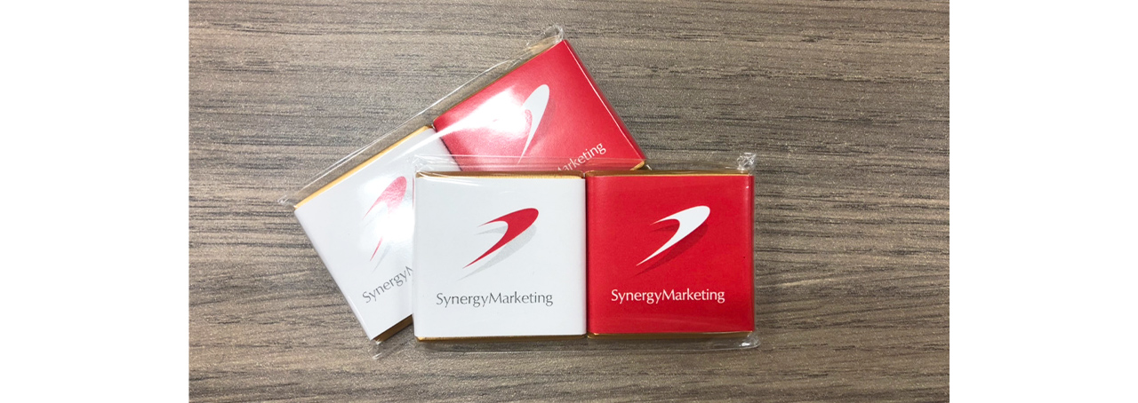 (写真:ゲストへのお土産の非公式ノベルティ、シナジー紅白チョコ。)