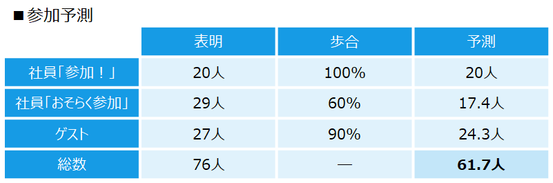 東京メンバーに「飲食物の発注の目安にしたい」という理由で、参加状況を「参加!」「おそらく参加」「欠席」でアンケートを実施。