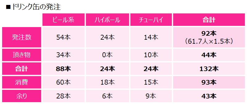 何かの懇親会の余りのチューハイや関連会社「スペースエンジン社」からのビール寄贈などで、当日計50本ほど増え、結果余りが出ましたが、予測の92本は良い読みでした!