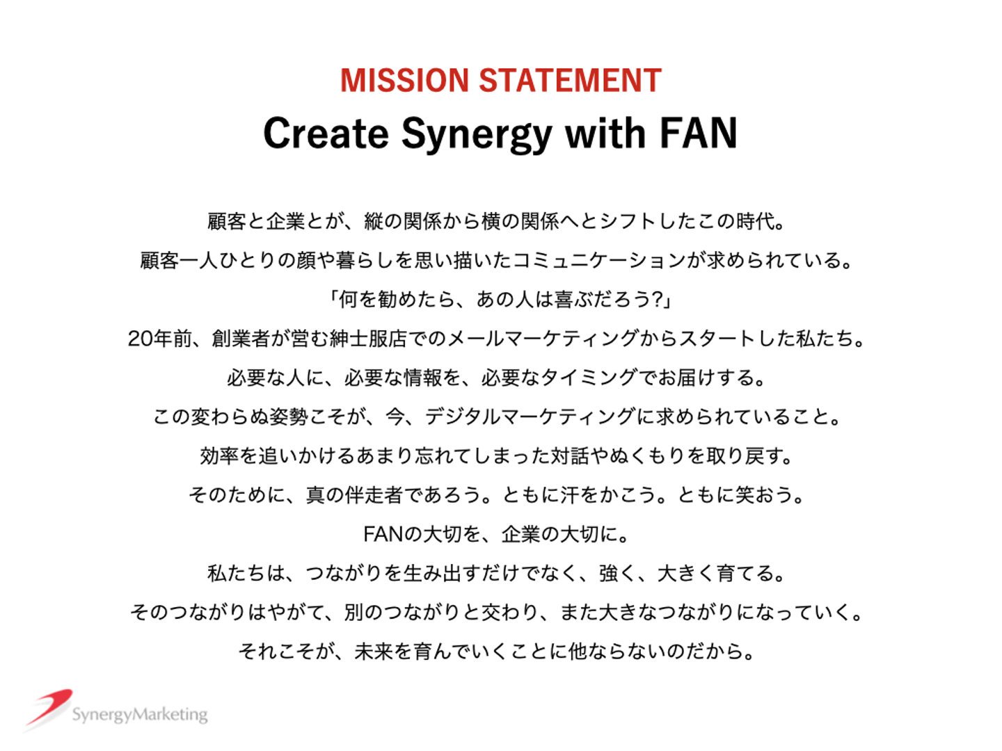 ミッションステートメントには、わたしたちがなぜシナジーマーケティングで働いているかの思いが込められています。社外の方にお見せするのは少し照れくさい文章ですが、ここには創業以来わたしたちが大切にしてきたことが詰まっています。
