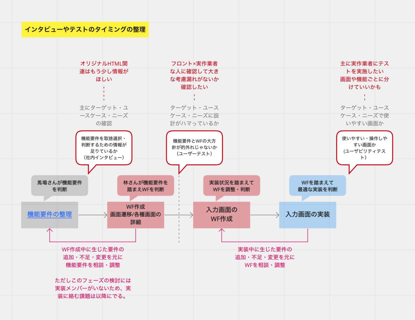 これをエンジニアも含めて段階的にWFレビューをするやり方に変更しました。Figmaで途中の過程をエンジニアに共有して、実現可能性や課題・リスク等をいっしょに議論しながらWF作成を行うようにしました。