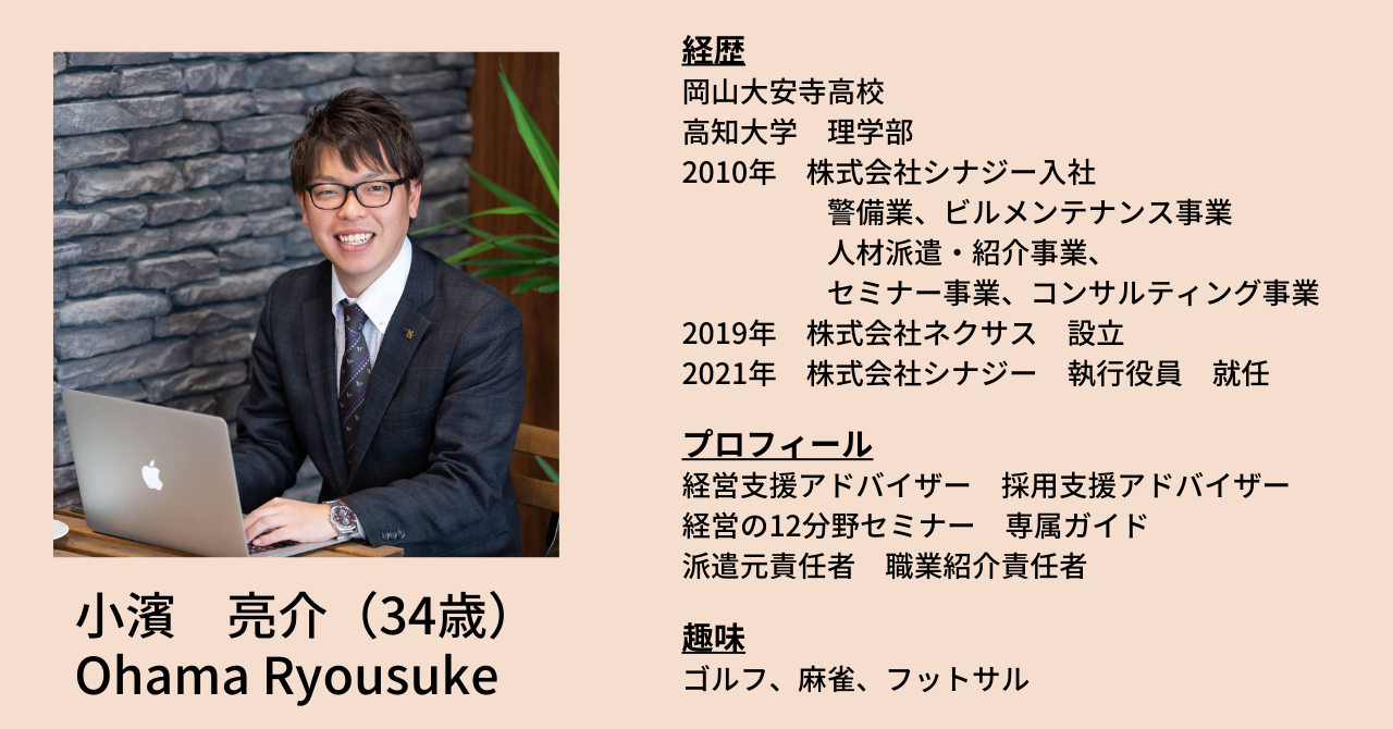 小濱:シナジーの経営に参画しているのと、他社への経営・採用コンサルも行っています。会社全体のビジョンとしては、売上10億円規模の会社を10社つくり、100億円規模にすることを掲げています。
