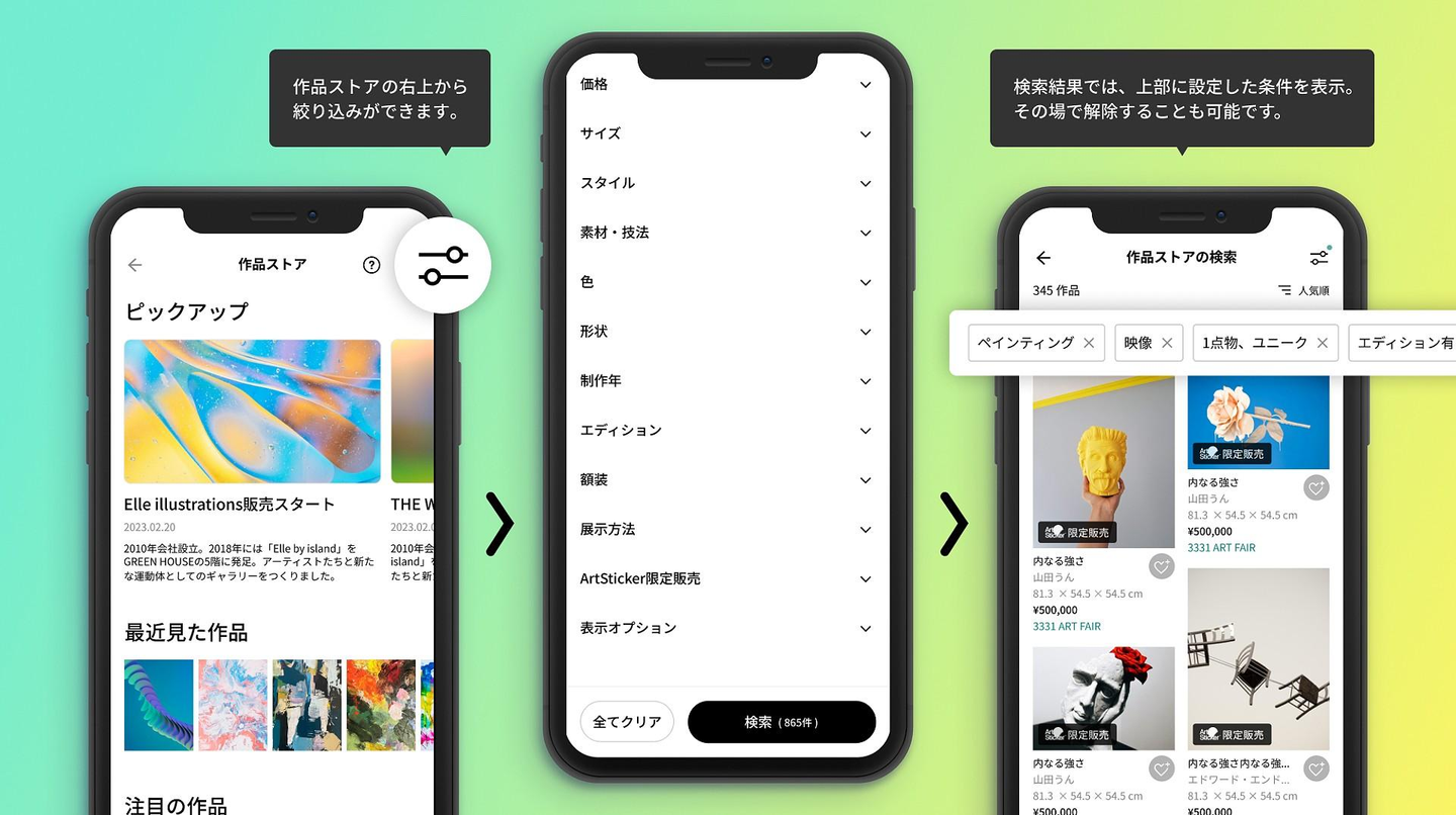 壁にかける, 空間で楽しむ, モニターで楽しむ など、展示・鑑賞の方法から作品を絞り込むことができます。その他、以下のような作品の基本情報からも絞り込みが可能になりました。