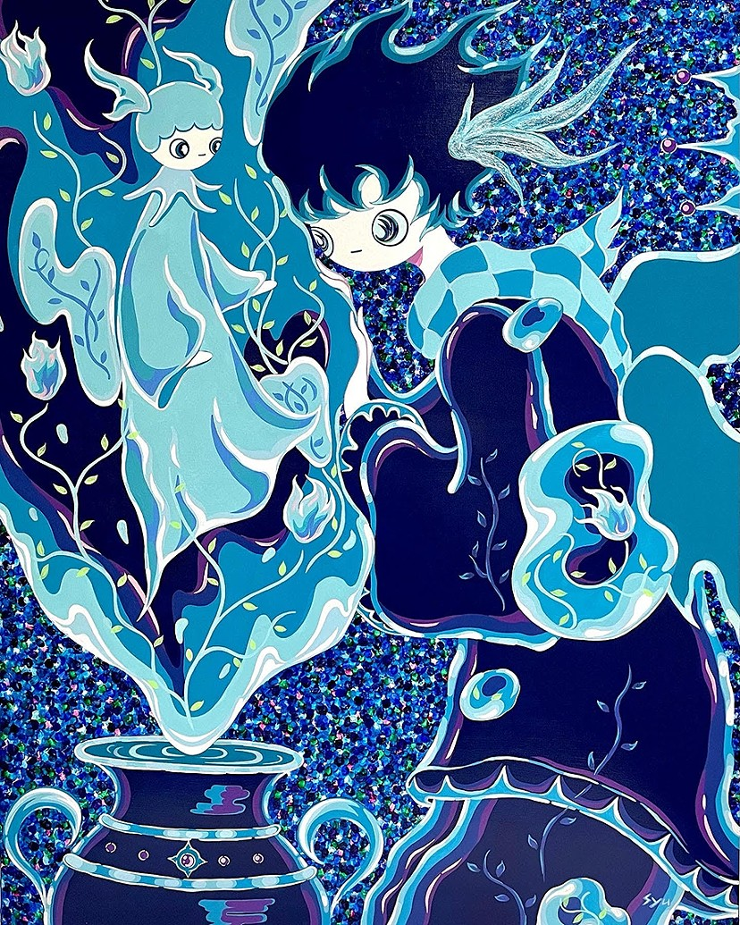 両親の影響で幼いころからサブカルチャーに通じ、写実的な表現に個性的な色をのせた表現が魅力的な若手作家だ。そんなcocoroが人物を描くのは、スマホを手放せない現代人にとっては液晶を通してみる人物達が、まさに現代の風景になっているからだという。