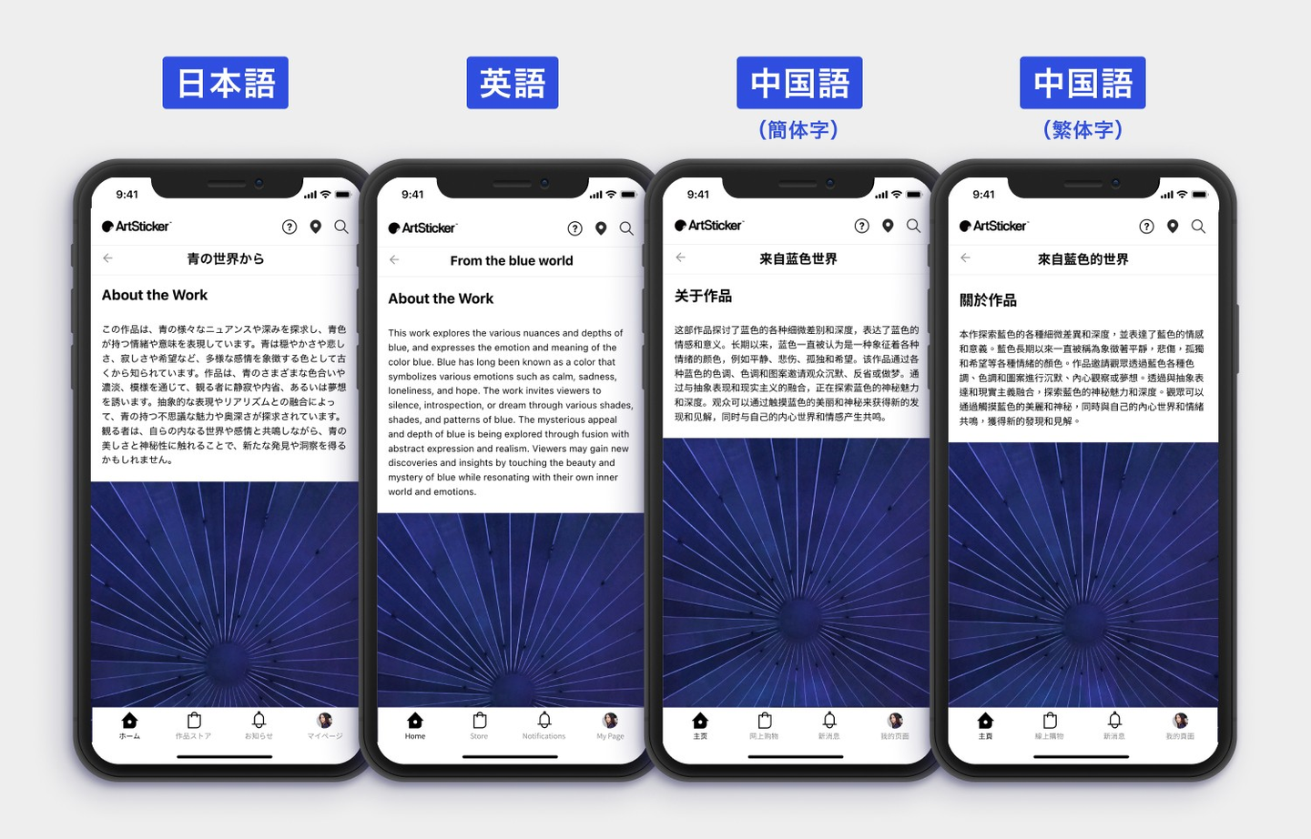 ArtStickerのサービスでは、ユーザーが日本語・英語・中国語(繁体字・簡体字)から、自由に言語設定を選ぶことができます。