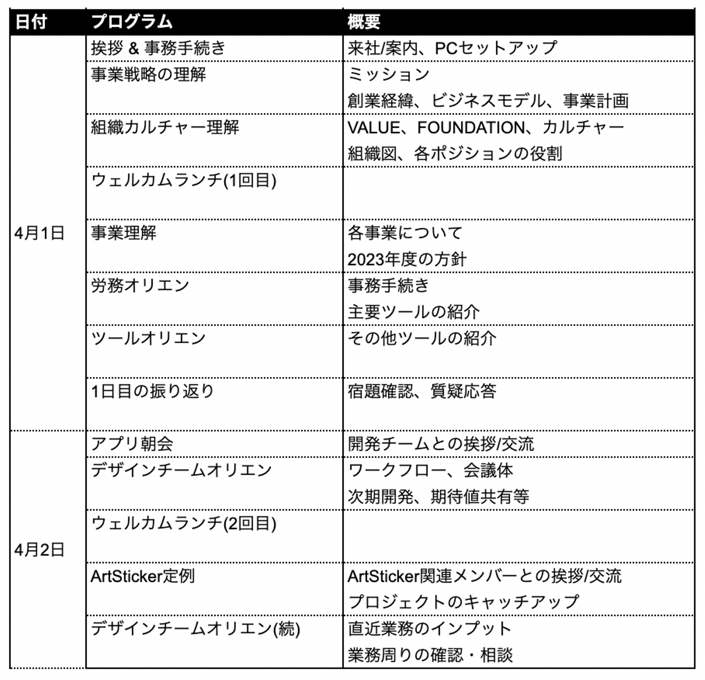 実際に当日2日間で行った「入社オリエンテーション」のプログラム一覧をご紹介します。