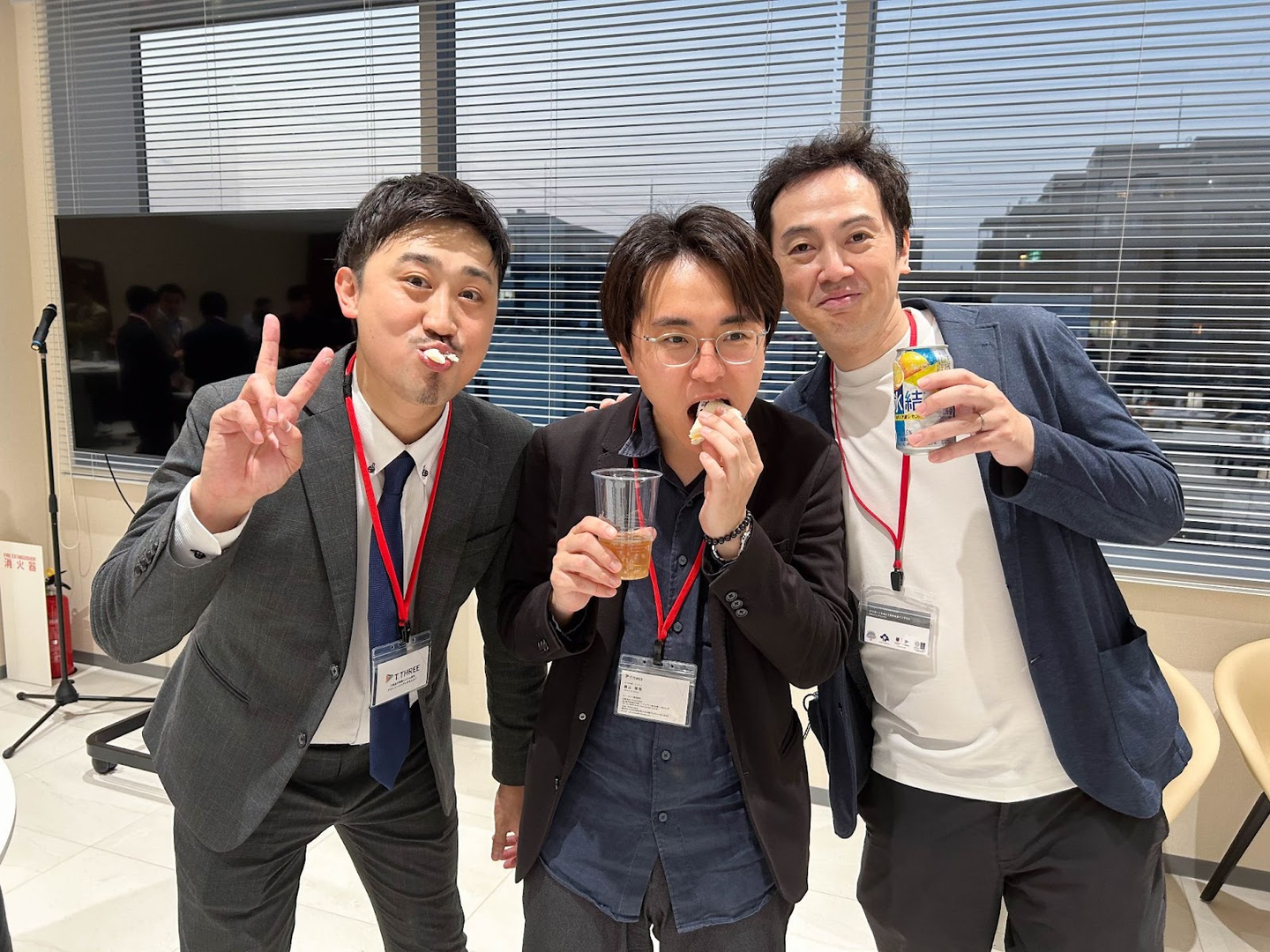 フルーツサンドを頬張るティースリーの営業部 猪口、エンジニア 横山、社長 榎本登志雄