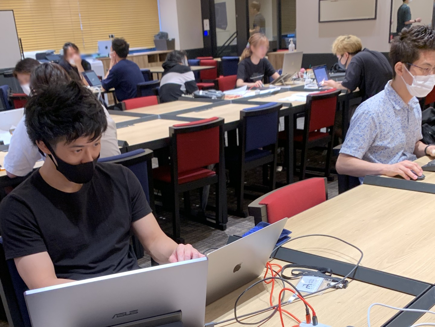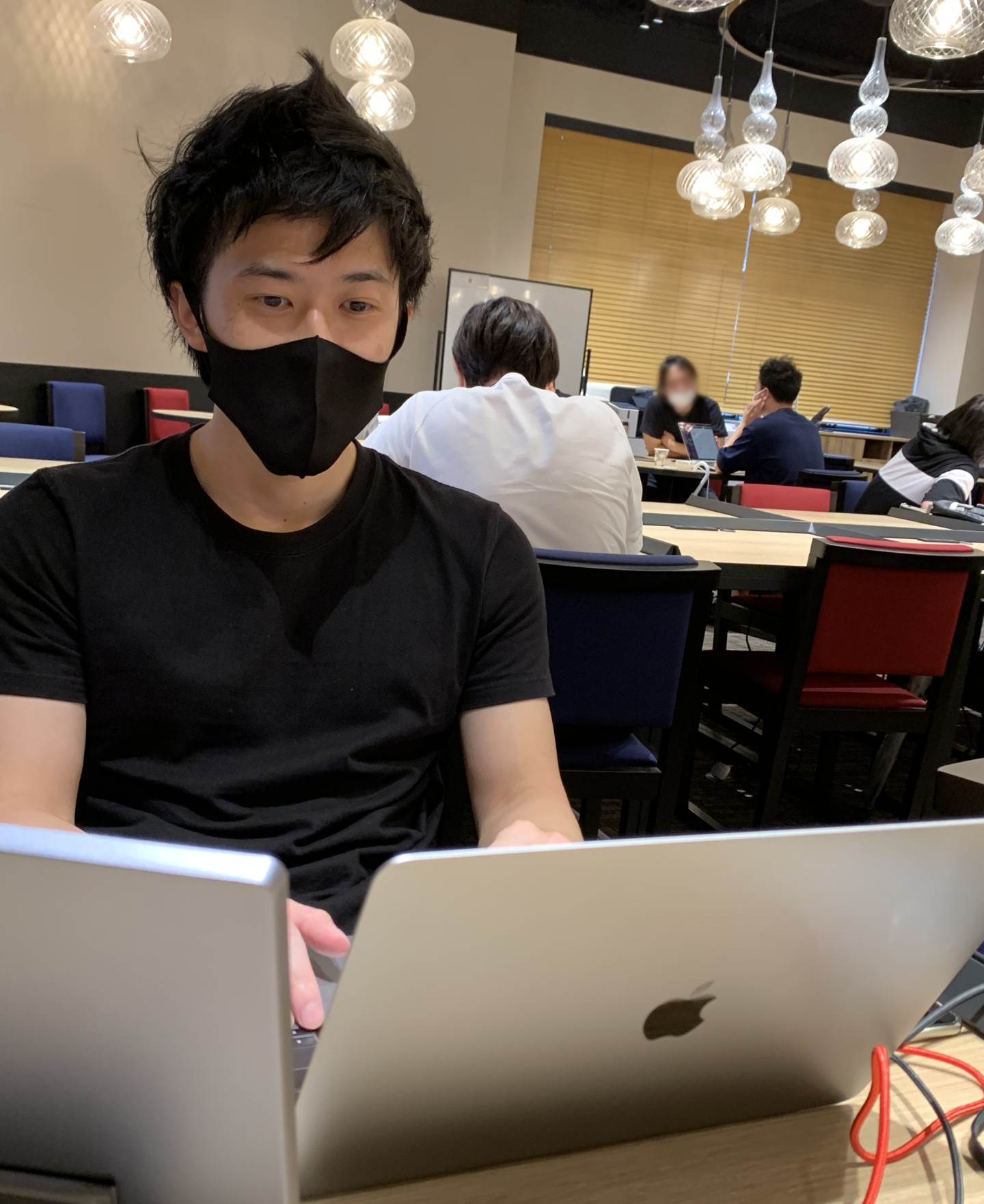 渋谷のコワーキングスペーススペースで作業中。リモートも一部可ですが、なるべくエンジニアチームで集まってコードを書いています。梶さんは、働き方に「フルリモートがいいなど、強いこだわりがある人はタビアンに向いてないかもしれない」と言っていました。