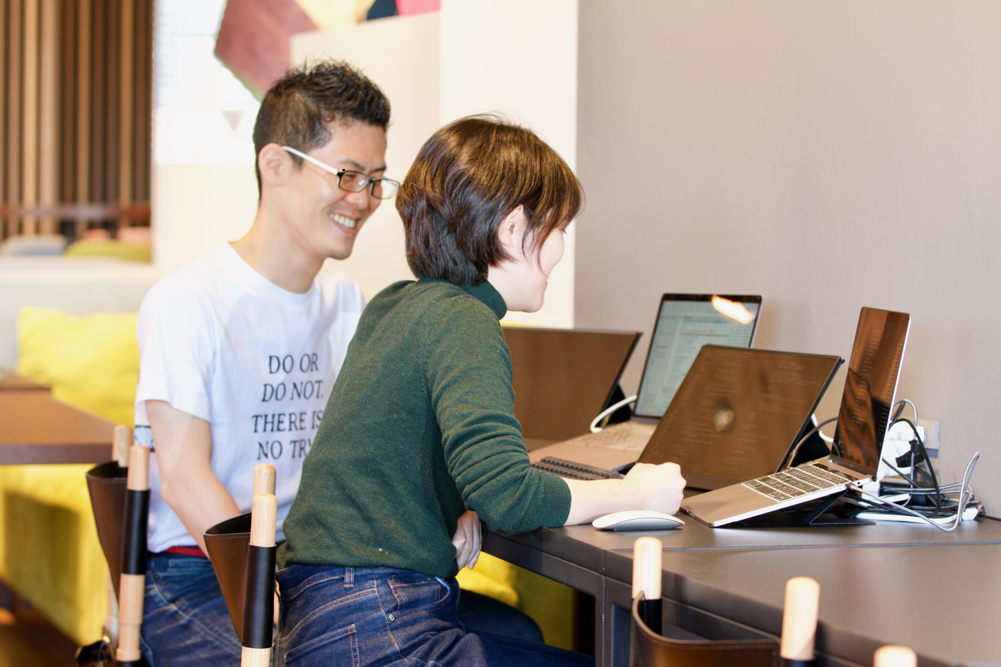 社長の難波さんと悠ちゃんの作業風景。インターン開始当時は今よりメンバーが少なく、よく2人でみっちり作業しているのを見かけました。なんとも濃厚なペアプロタイム。