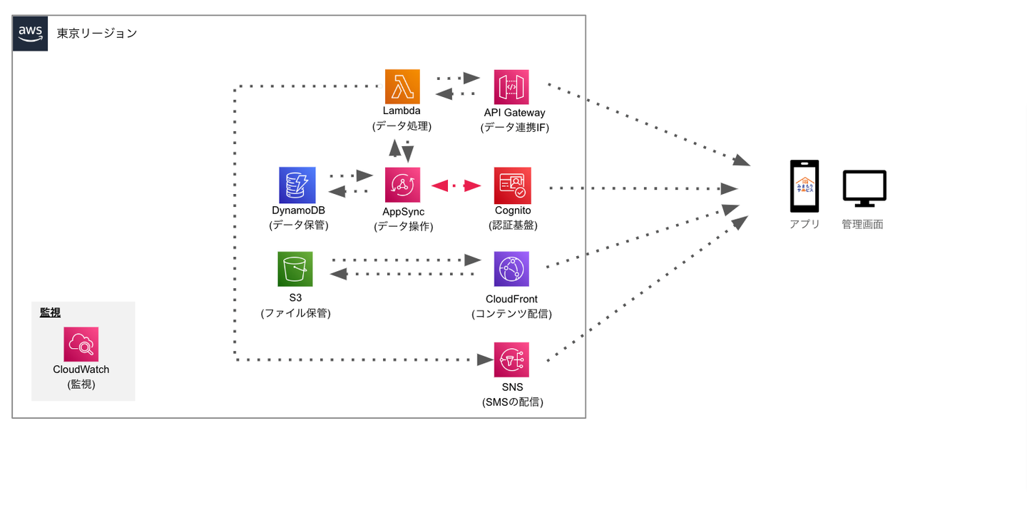 管理画面側はほかのWebアプリ開発プロジェクトでもよく活用するVuetify、Nuxt3を使用しています。管理画面はVuetifyとNuxt3は最新版を使用し実装されており、バックエンド側はモバイルアプリと管理画面で共通のため、Cognito、AWS Lambdaなど共通のものを使用しています。スマートフォンからも管理画面からも参照されてシステムが動いているようなイメージです。