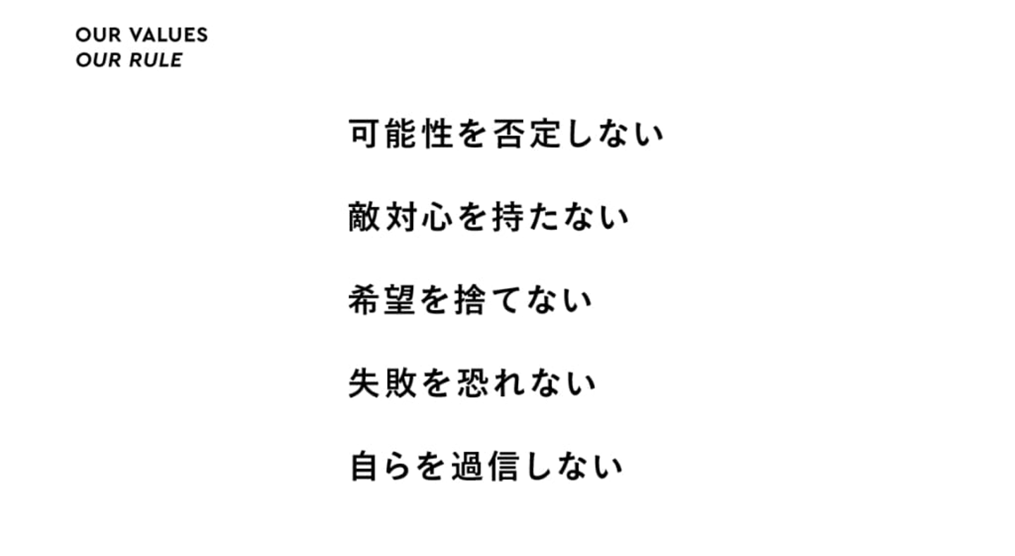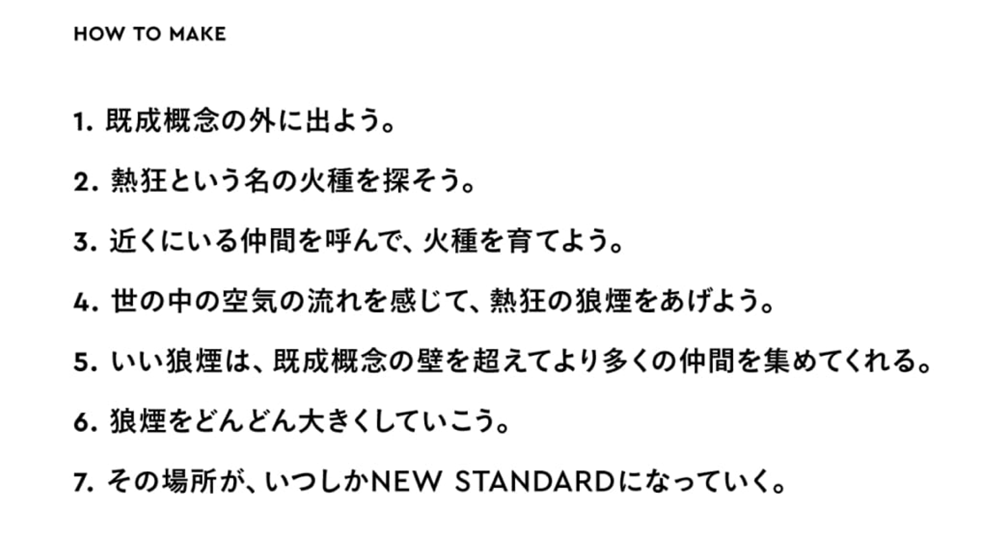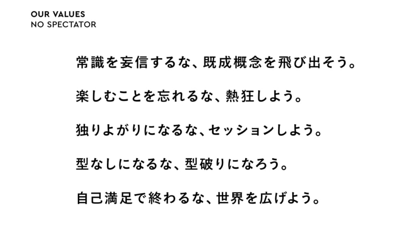 私たちはNEW STANDARDへの社名変更に際し、コーポレートアイデンティティを刷新し、「BI(Behavior Identity=行動の統一)」を制定しました。「OUR VALUES(『NO SPECTATOR』と『OUR RULES』」と「HOW TO MAKE」の2つで構成されたBIを体感できるのも、ランチ文化です。