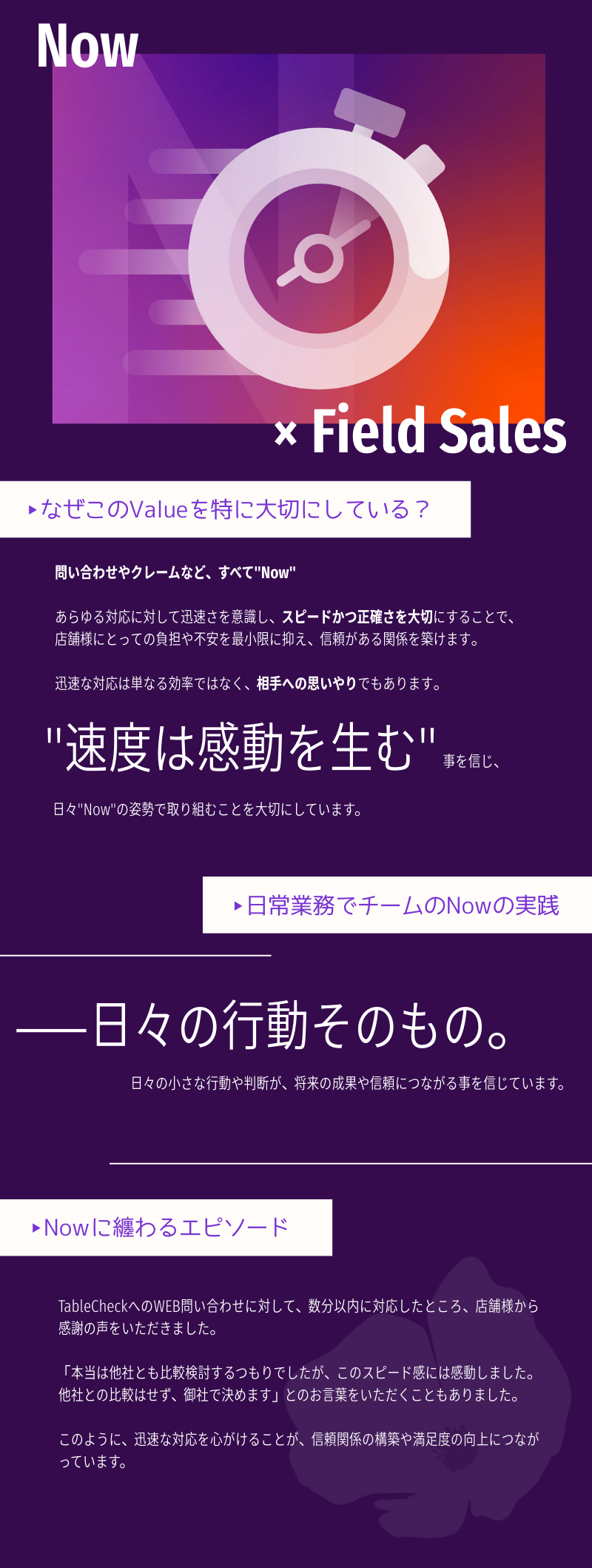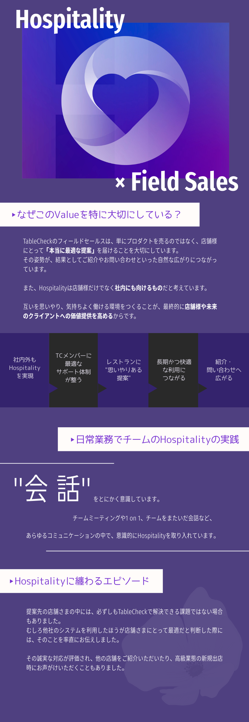 フィールドセールスの仕事は、レストランの課題に向き合い、最適な提案を届けること。そのために特に大切にしているのが “Hospitality” と “Now”です。