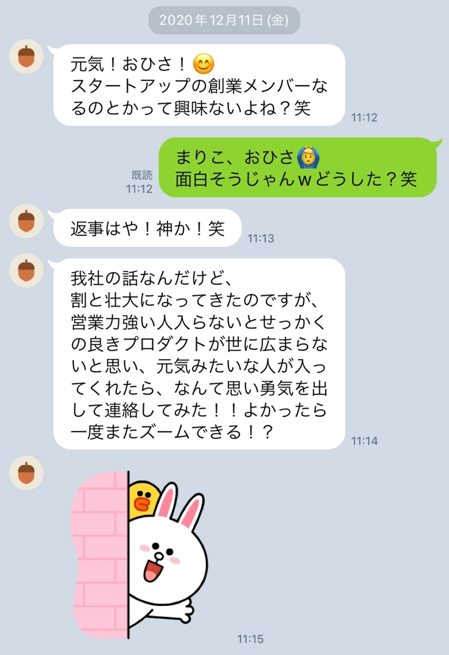リクルートスタッフィングの新卒同期だった村田磨理子から突然(かなり突然)連絡が来たのでした。どうやら会社を始めたらしいというのは、人伝で聞いており、一旦オンラインで話してみることに。