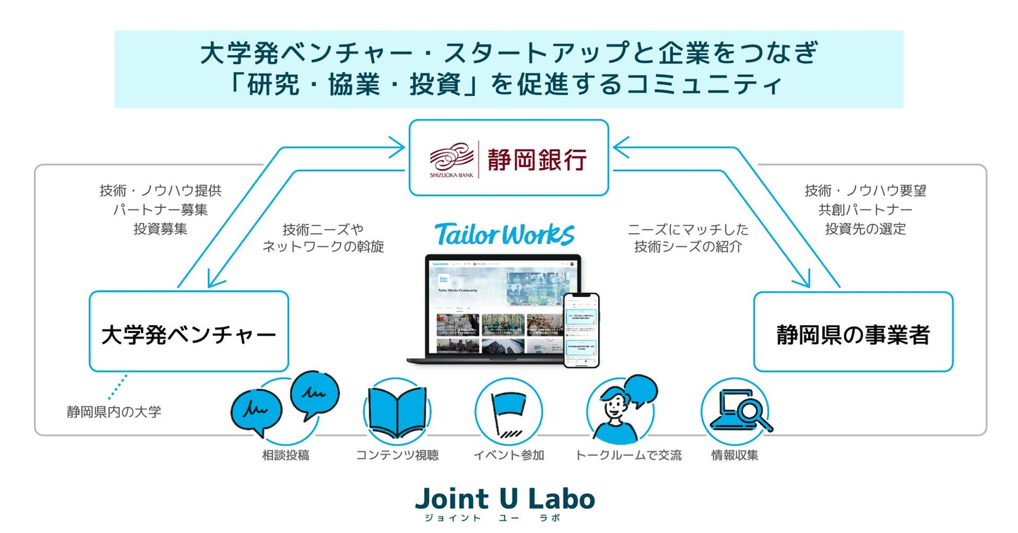 株式会社テイラーワークス(所在地:東京都渋谷区:代表取締役会長 山本 浩之/代表取 締役社長 難波 弘匡、以下、テイラーワークス)は、静岡銀行が、コミュニティアプリ 「Tailor Works(テイラーワークス)」上に大学発ベンチャーの発展を支援するオンライ ンコミュニティ「Joint U Labo(ジョイント ユー ラボ)」を開設したことをお知らせします。