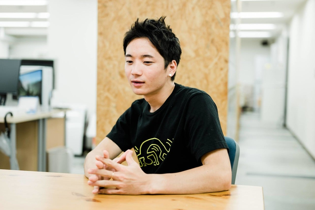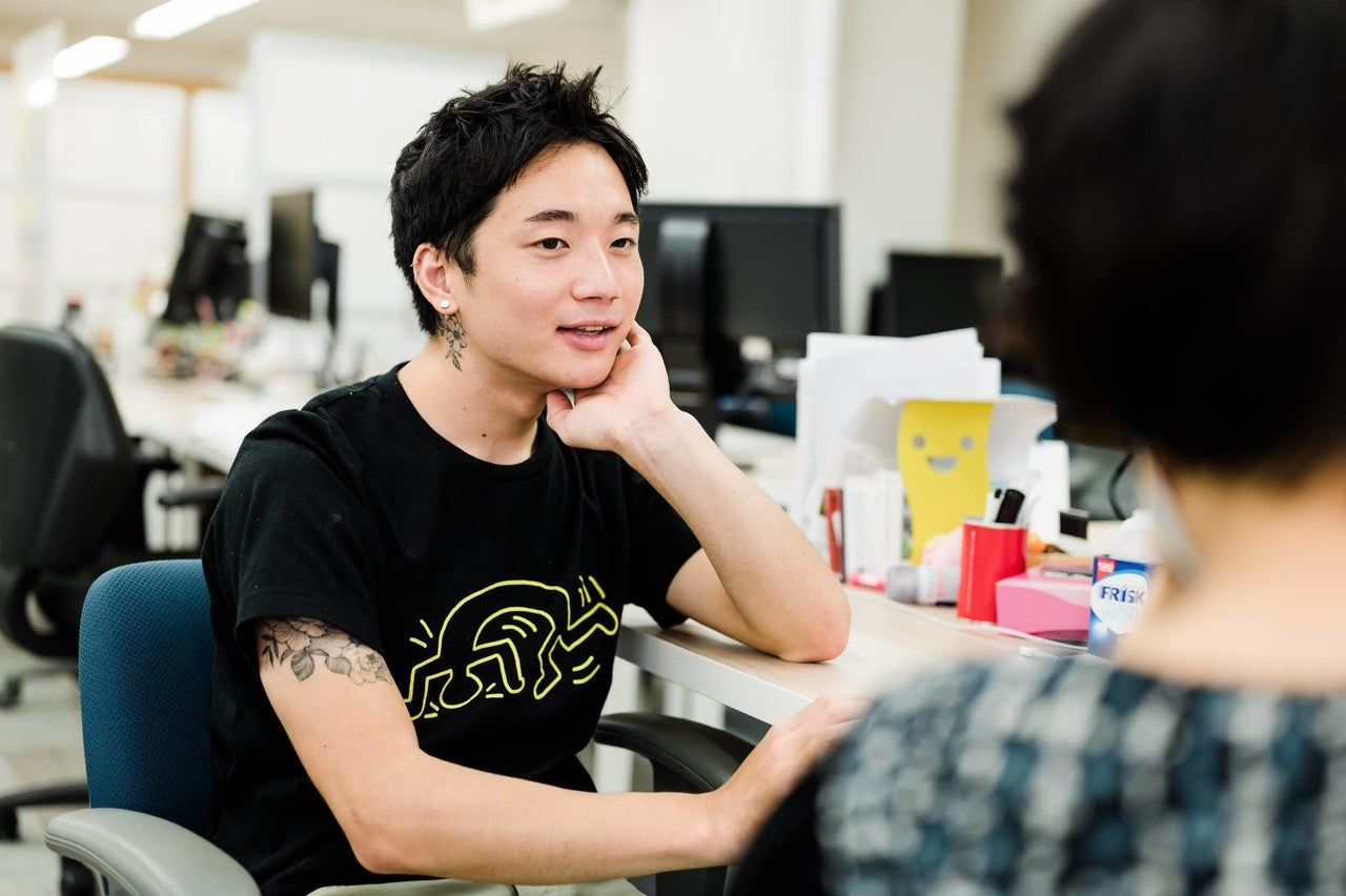 デジタルエージェンシ―TAM入社5カ月目の岸本拓己さんは、1997年生まれのZ世代。在学中の居酒屋経営、大学中退、フィリピンでのインターンとユニークな経歴を持つ上、自らバイセクシャルであることを公言し、首元には花のタトゥーが光っています。