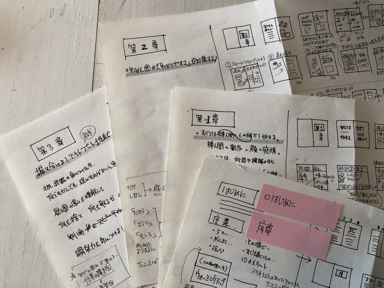 例えば200ページの本を書くというのはとても怖かったんですが、4枚の紙に200ページ分を50個の四角いマスで書いてみたら、「あ、たった4枚なんだ」って思ったんですね。怖いものをなるべく目に見えるものにすると、暗闇で怪獣だと思っていた敵が、ライトで照らしてみたら小鹿ちゃんだったぞ・・・みたいな(笑)。