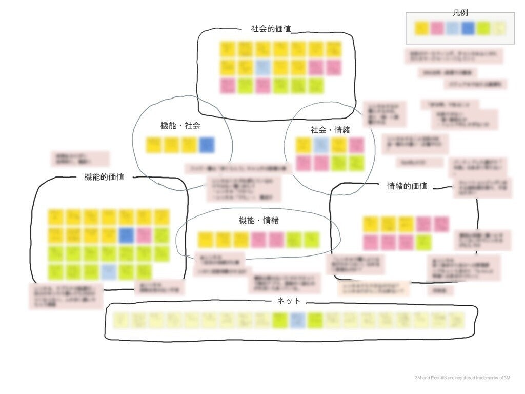 そこでなんとなく顧客像の傾向が出てくるので、それを「社会的価値」「機能的価値」「情緒的価値」の3つの枠に分けて、集まった要素を整理します。例えば、「場違い・目立ちすぎはNG」とか、「褒められたらうれしい」とか。