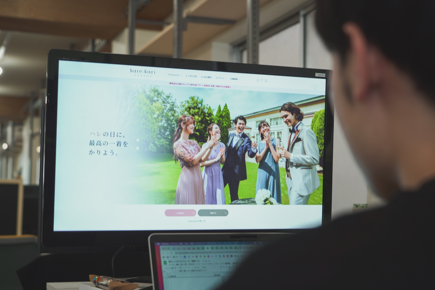 このレンタルサービスはもともと「洋服の青山オンラインストア」のECサイト本体にあったのですが、それを独立させて展開していきたいというご要望をいただいて、サービス名「ハレカリ」の立案からサイト構築、デザイン、運用までお手伝いさせていただいています。