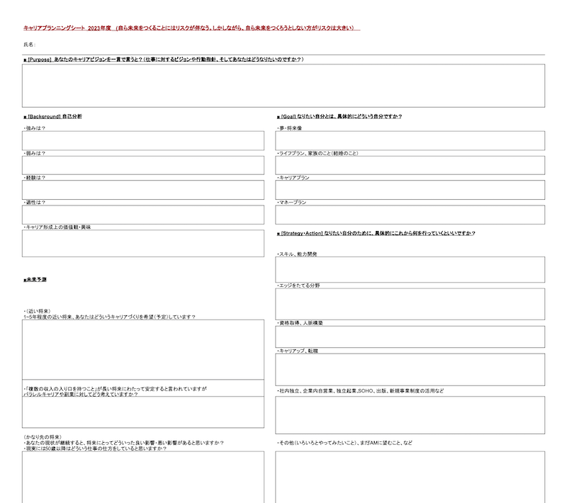角谷:キャリアシートには、まず「どうなりたいか」というキャリアビジョンを一言で書き込む欄があります。その下に、自分の強みや弱みを書いて自己分析する欄、将来を短期と長期に分けて予測する欄があります。