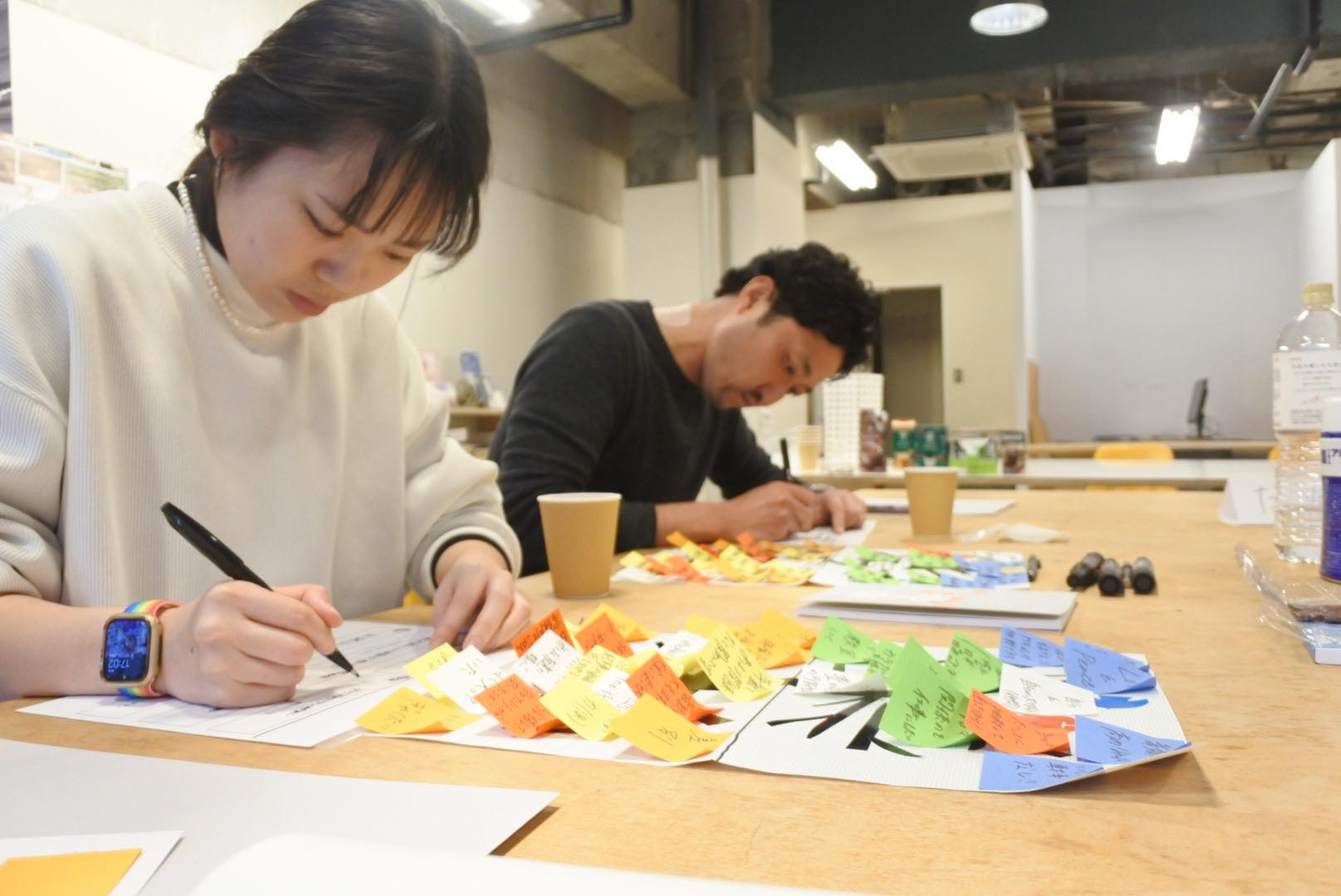 ビジネスの会議などで「ふせんに意見を貼る→ブレスト、合意形成する」という時間も「ワークショップ」と呼ぶことがありますが、今回は合意形成よりも「オープンでゆったり、気づきや学びの場をつくるスタイル」で進行しました。